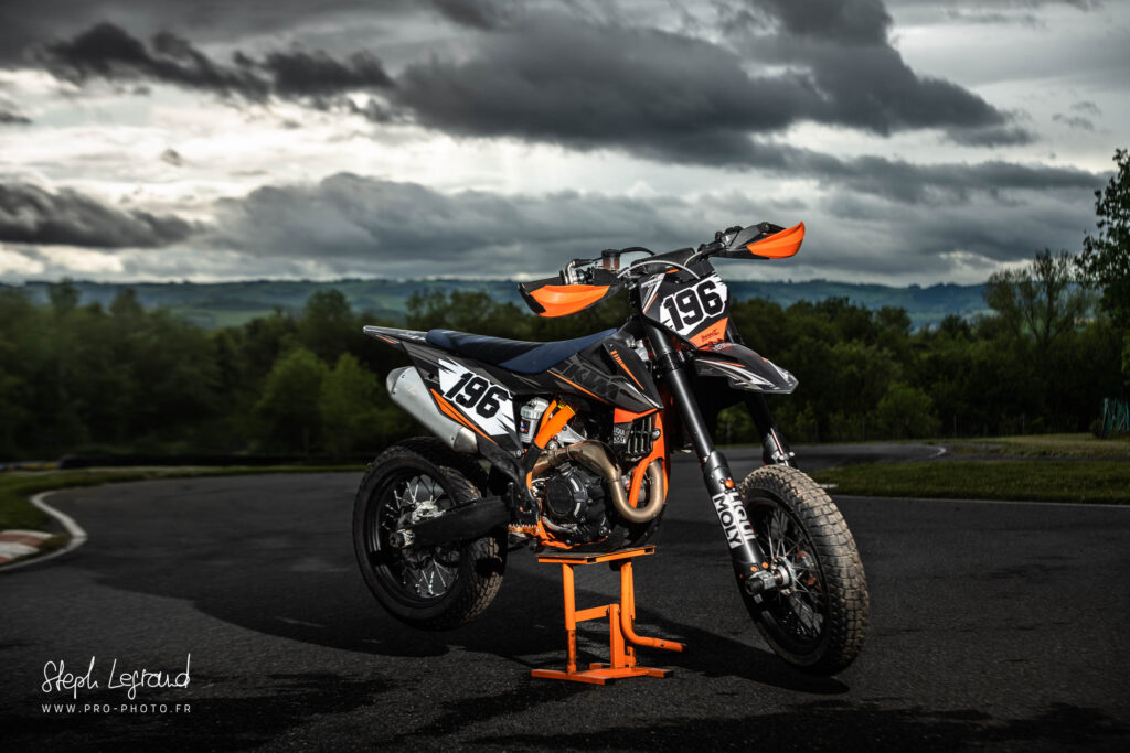 Un beau cliché du KTM 450 SMR de Footrest Grinder au circuit de Belmont sur Rance à la tombée du jour, juste avant l’épreuve de 2023. L’absence de soleil n’est finalement pas un gros inconvénient, avec des nuages menaçants qui fournissent un cadre spectaculaire.