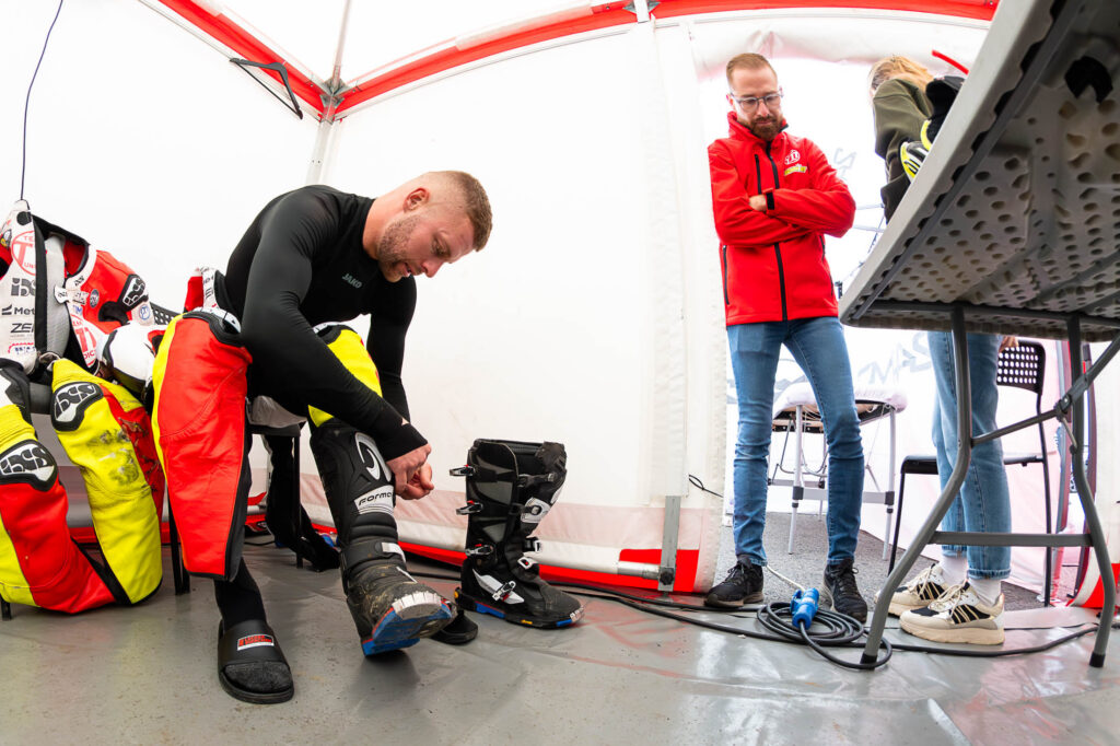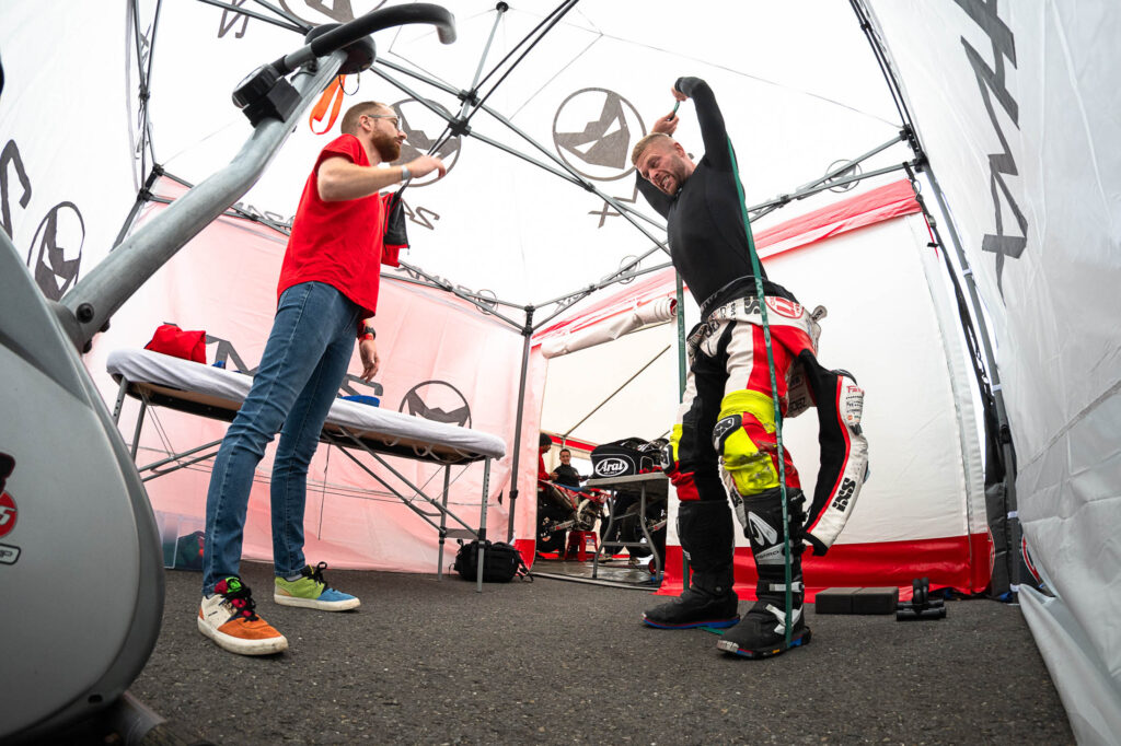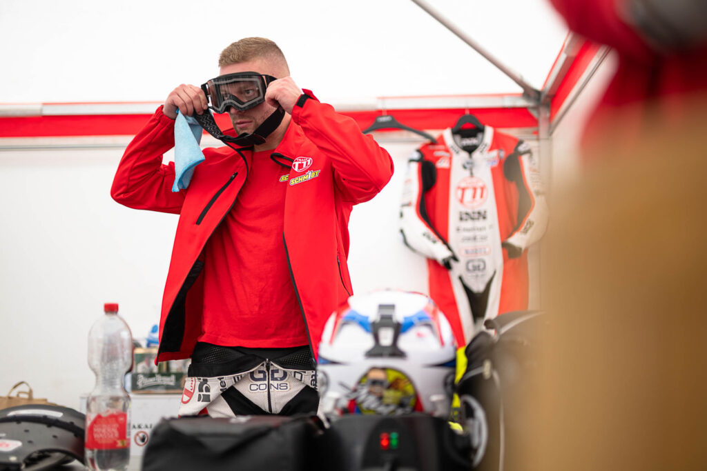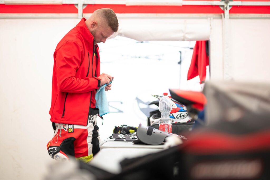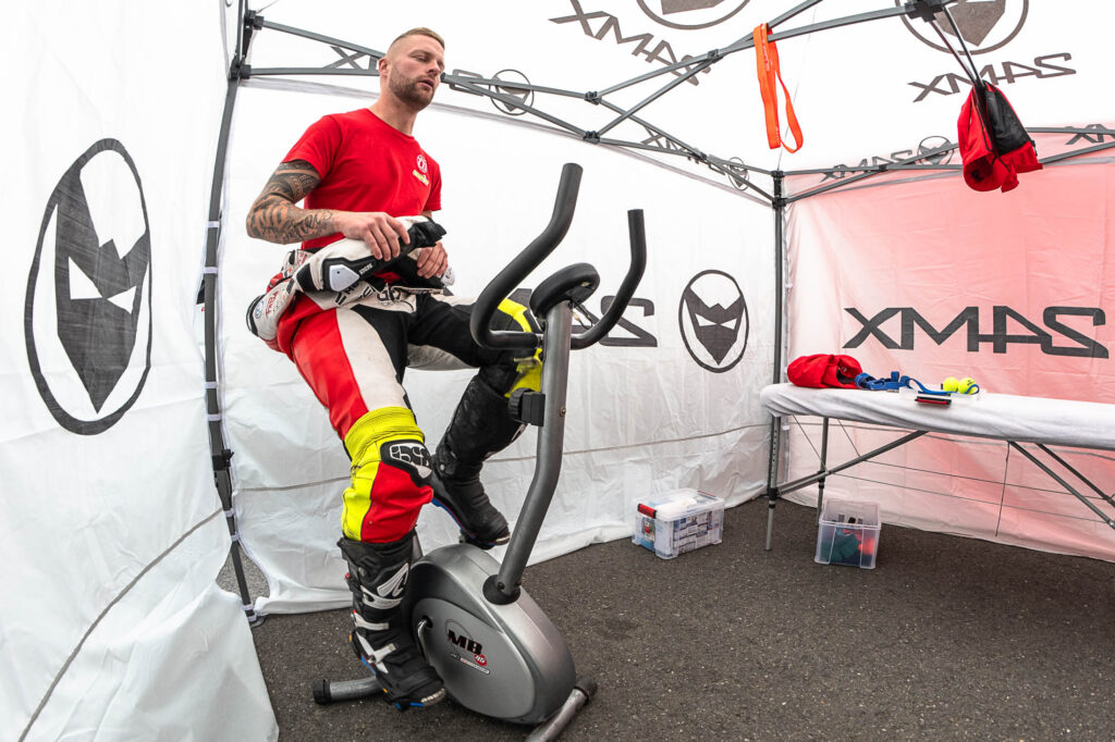 Le circuit se réveille au rythme des moteurs – le Superbiker commence à battre. Dans le paddock, les mécanos peaufinent les machines. Pour Marc-Reiner Schmidt, c’est le moment de se centrer : séances de préparation physique, mise en route du corps, premiers tours de roue sur le circuit de Mettet. Ces photos saisissent la précision et le calme d’un champion avant la tempête. Chaque geste compte, chaque détail prépare la victoire. L’atmosphère est électrique, mais la concentration reste totale.