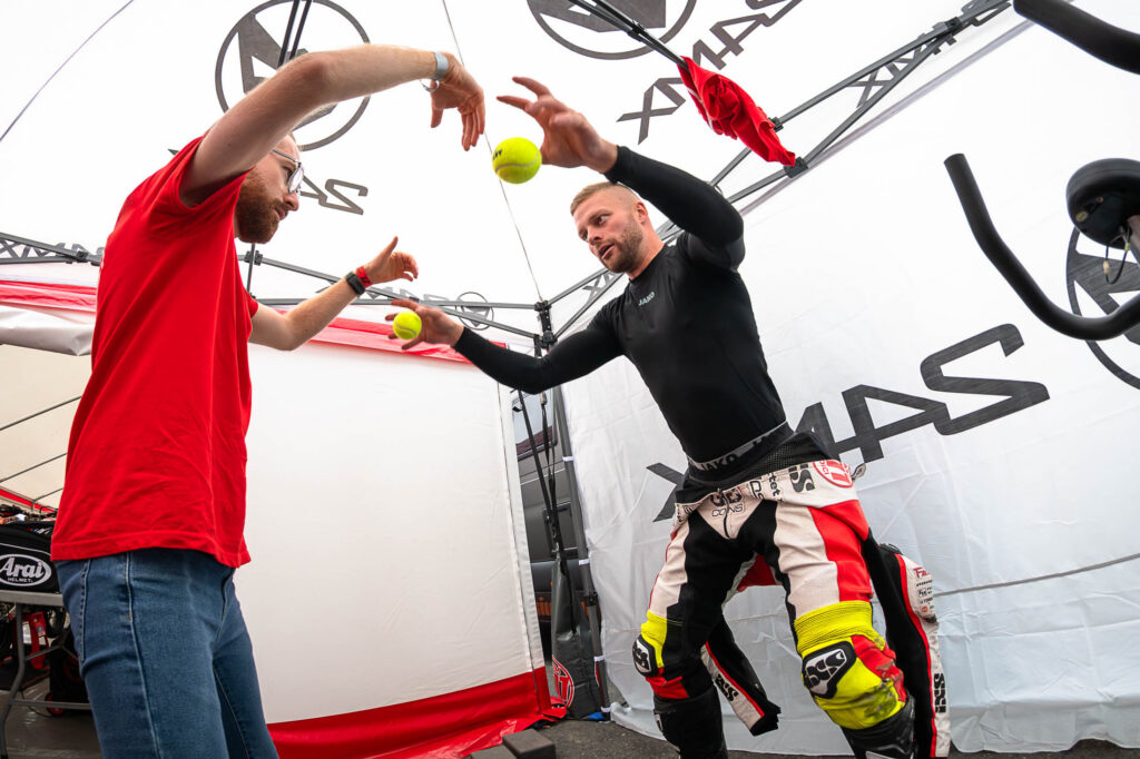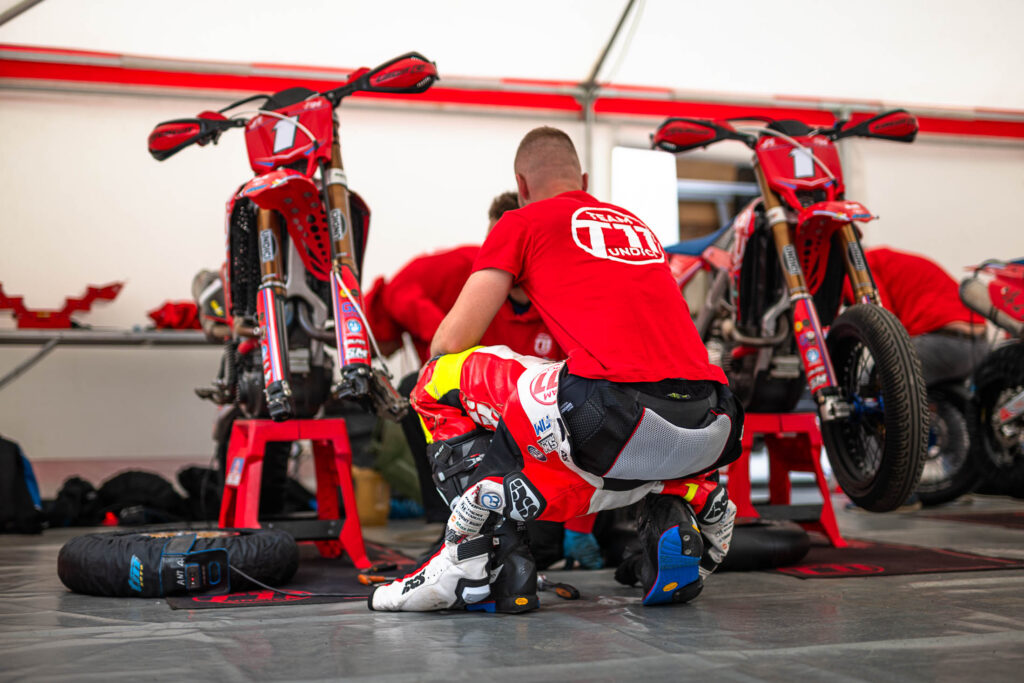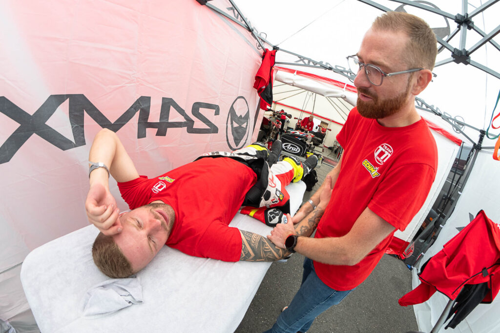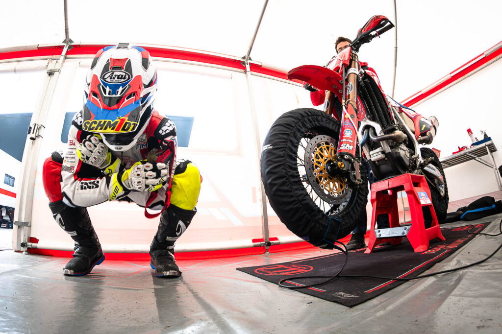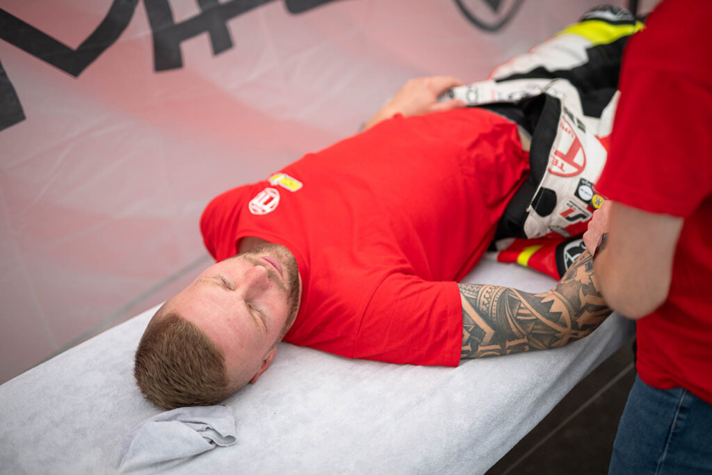 Le circuit se réveille au rythme des moteurs – le Superbiker commence à battre. Dans le paddock, les mécanos peaufinent les machines. Pour Marc-Reiner Schmidt, c’est le moment de se centrer : séances de préparation physique, mise en route du corps, premiers tours de roue sur le circuit de Mettet. Ces photos saisissent la précision et le calme d’un champion avant la tempête. Chaque geste compte, chaque détail prépare la victoire. L’atmosphère est électrique, mais la concentration reste totale.