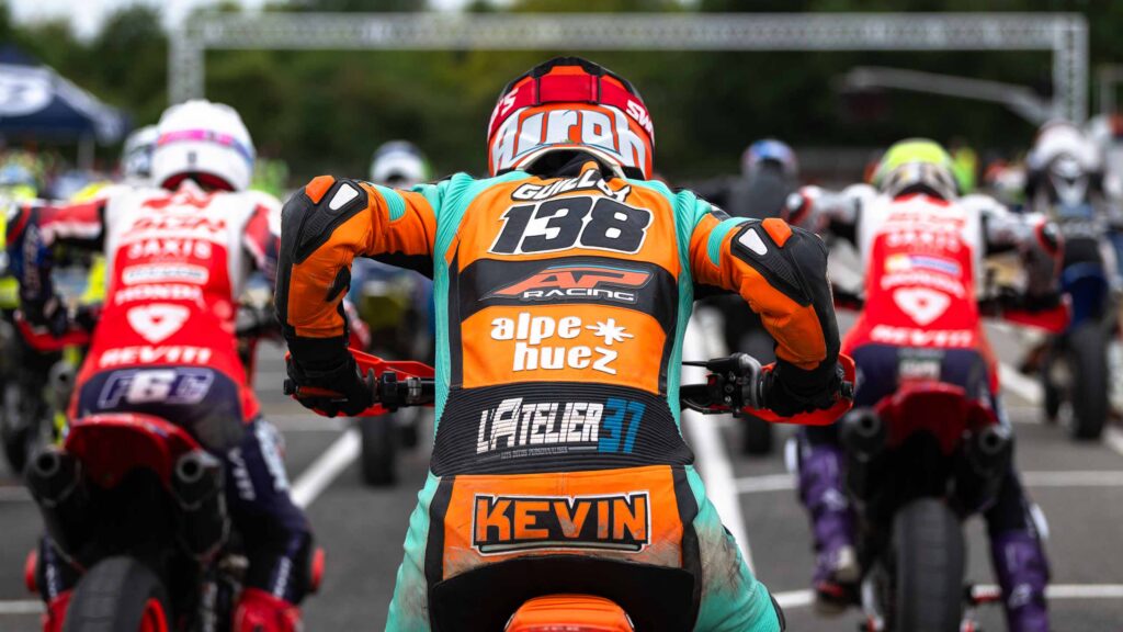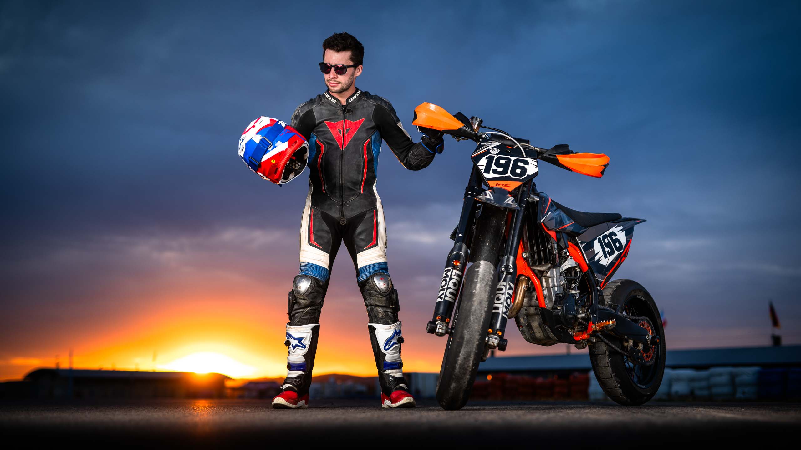 Un extrait d’une série, encore un coucher de soleil, cette fois avec Footrest Grinder et son KTM SMR 450 sur le circuit de Mirecourt. On a fait ce shooting le lendemain de celui avec Axel — les nuages changent complètement l’atmosphère.