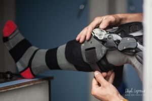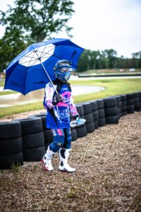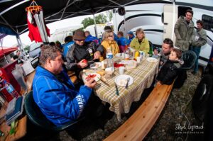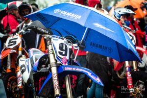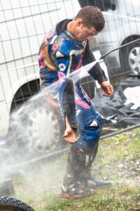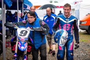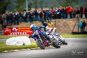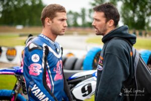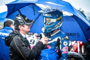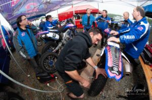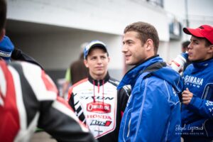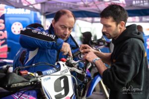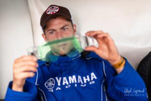 Votre serviteur a donc eu l’occasion de suivre Waren Bougard pas à pas lors de cette journée du dimanche. Contrairement au samedi, la météo était menaçante. La séance de warm-up à 8h s’est déroulée au sec, mais les prévisions pour la suite de la journée étaient à la pluie. Pour le choix des pneus — slicks ou pluie — il vaut toujours mieux une pluie franche qu’une météo incertaine. Pour les pilotes de la catégorie Prestige S1, la catégorie reine du championnat, les courses avaient lieu le dimanche après-midi. C’est toujours le cas. Après les warm-ups à 8h, c’est donc une longue d’attente pendant la matinée. Elle se passe entre discussions et rencontres dans le paddock, discussion des réglages de la moto avec le mécanicien, préparation de l’équipement, reconnaissance sur le circuit, repas, …